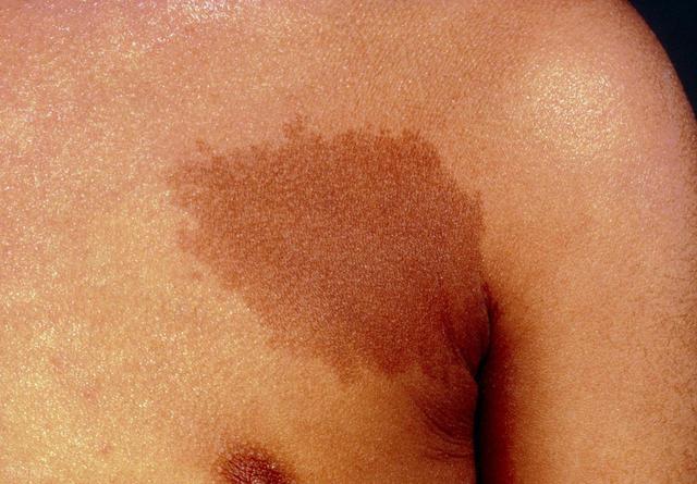 咖啡斑也与遗传因素有关,可在出生时或出生后不久出现,颜色呈淡褐色至深褐色,形状不规则,边界清晰。它是由于皮肤局部黑色素细胞活性增加,产生过多黑色素沉积形成的,通常会随着年龄增长而逐渐变大、增多,但一般不会对健康造成影响。